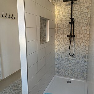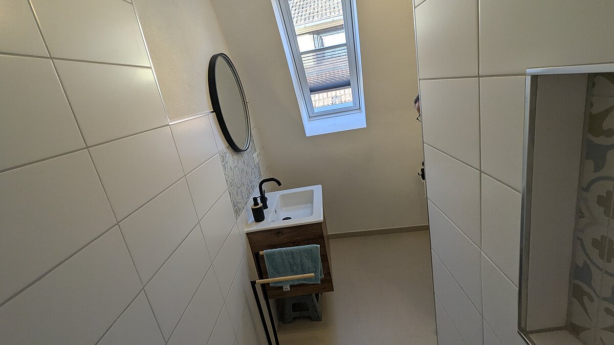 Das moderne Badezimmer ist mit einer großen, begehbaren Dusche (1,40 m x 0,90 m) ausgestattet und bietet einen Waschtisch mit beleuchtetem Spiegel sowie einem separaten beleuchteten Schminkspiegel. Für Komfort sorgen Seifenspender, Zahnputzbecher, Fön und ein kleines Radio.