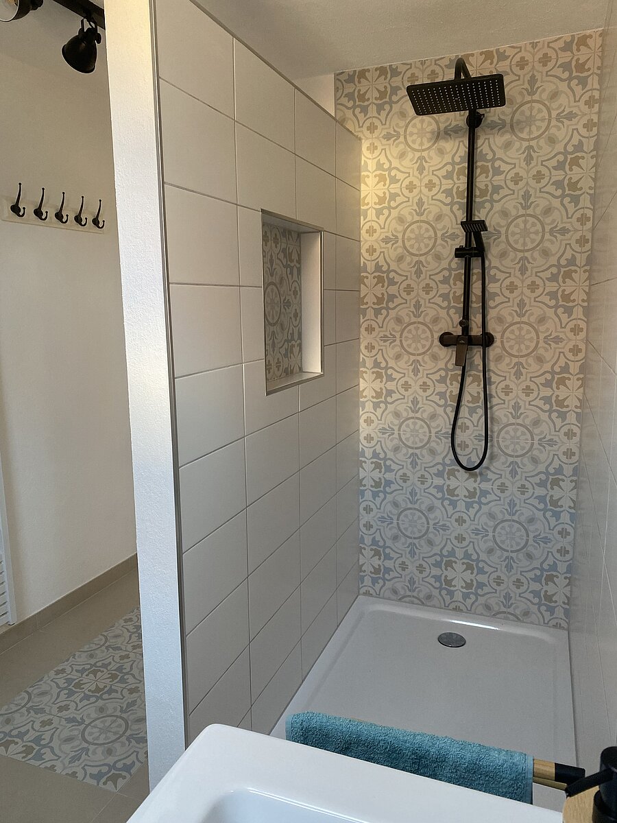 Zahlreiche Handtücher, Badetücher und Duschvorleger stehen für Sie bereit, ergänzt durch praktische Handtuchhalter – ideal für einen entspannten Start in den Urlaubstag.