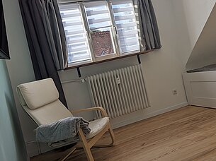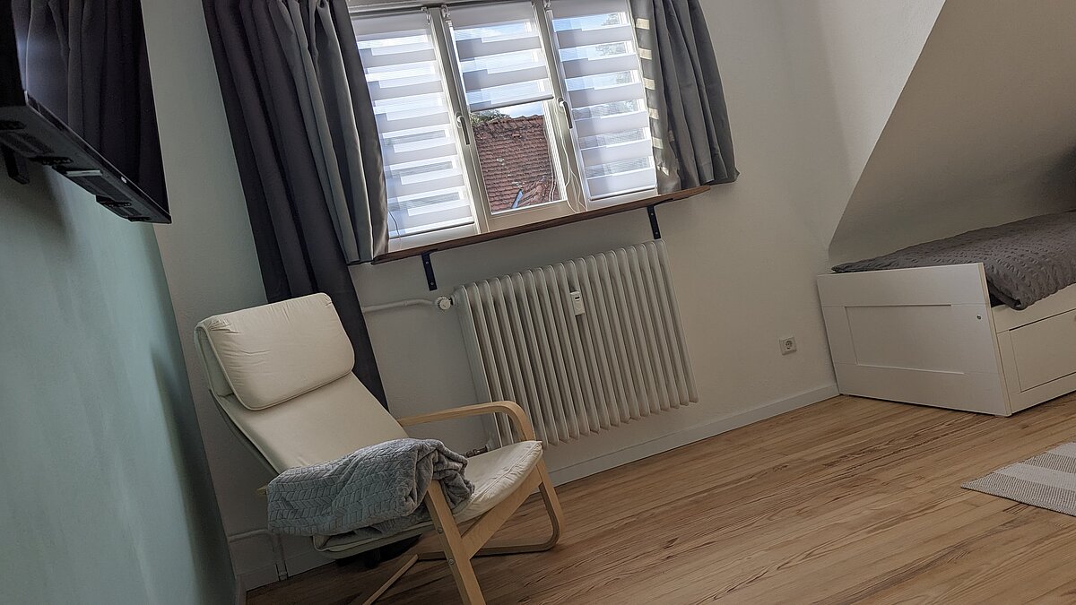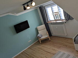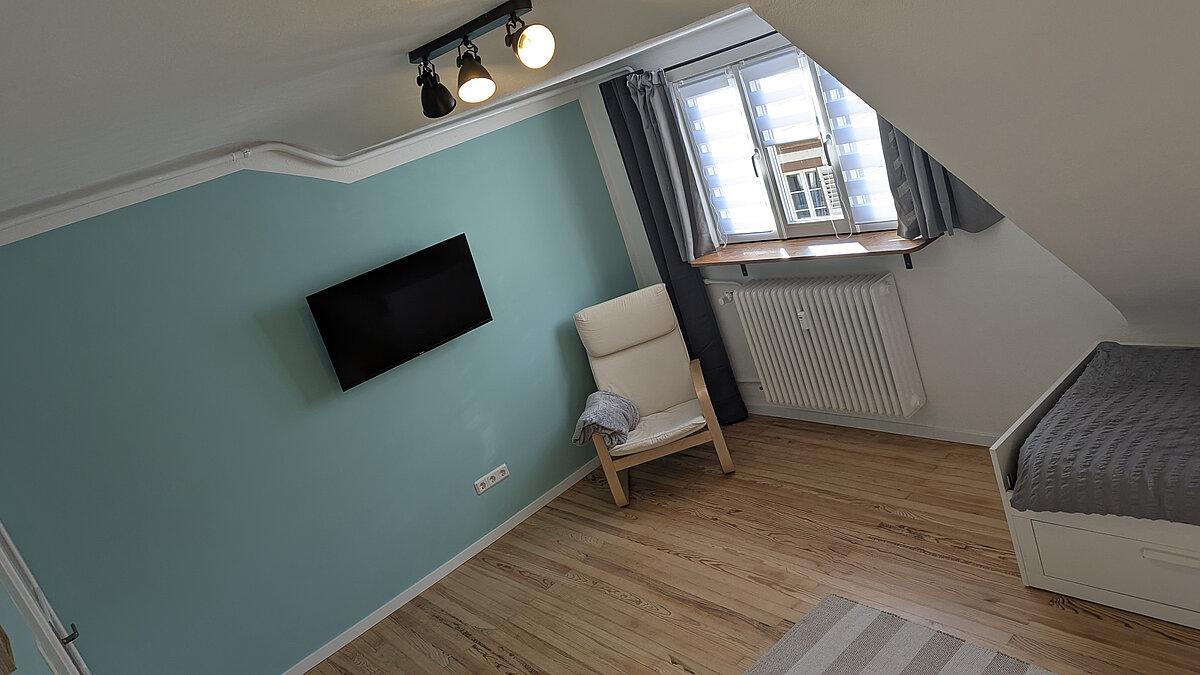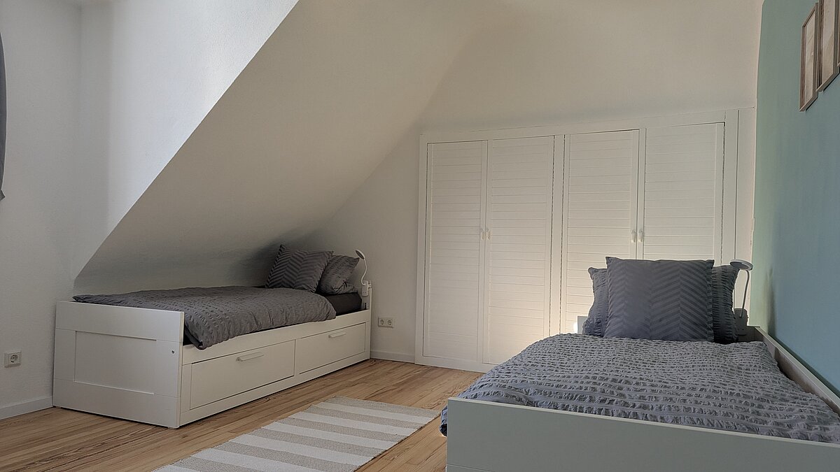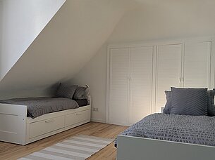 Dieser gemütliche Raum bietet zwei Einzelbetten (je 0,80 m x 2,00 m, ausziehbar auf 1,60 m x 2,00 m) – ideal für Kinder, Freunde oder zusätzliche Gäste. Für angenehmes Licht sorgen Klemmleuchten an jedem Bett, und der Wandschrank mit Regalböden und Kleiderstange bietet reichlich Stauraum. Ein bequemer Sessel lädt zum Entspannen ein, während der Smart-TV für Unterhaltung sorgt. Besonders praktisch: die Kommode, die sich im Handumdrehen zu einem Wickeltisch verwandeln lässt – perfekt für Familien mit kleinen Kindern.
